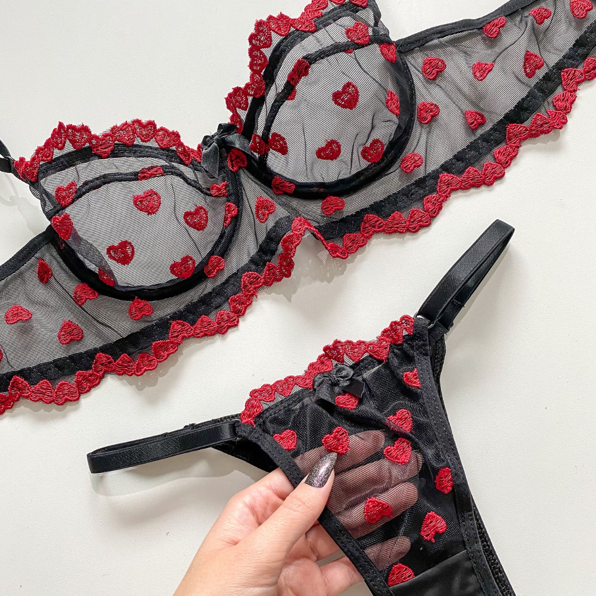 Conjunto love é todo bordado com corações que remetem ao romantismo, e a transparência do tule da toda a sensualidade para esse conjunto, ele possui aro de sustetação, é sem forro na parte do busto e as alças são reguláveis.